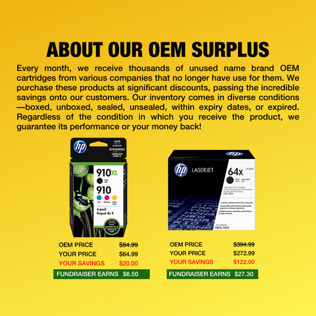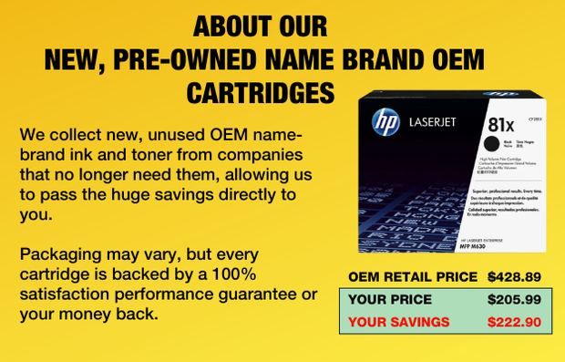 OEM refers to Original Equipment Manufacturer. These are the companies that make your printer, such as HP, Canon, Epson, and Brother. OEMs also sell the cartridges specifically designed for their printers. Every month, we acquire thousands of unused OEM cartridges from various companies that no longer have use for them due to printer upgrades or changes. We purchase these products at significant discounts, enabling us to pass on incredible savings to our customers. Our inventory comes in diverse conditions—boxed, unboxed, sealed, unsealed, within expiry dates, or expired. Rest assured, regardless of the condition in which you receive the product, we guarantee its performance will match that of a brand-new purchase, albeit at a more affordable price.