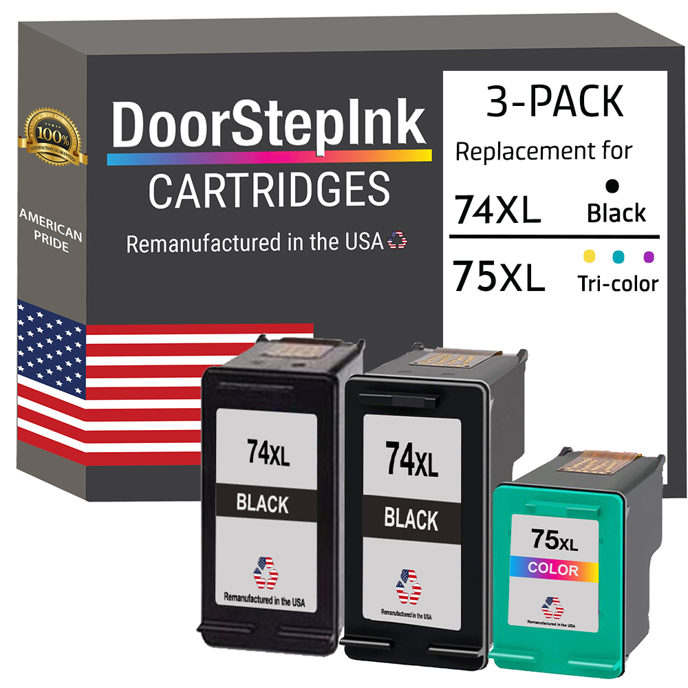 DoorStepInk Brand for HP 74XL 2 Black / 75XL 1 Color 3-Pack Remanufactured in the USA Ink Cartridges